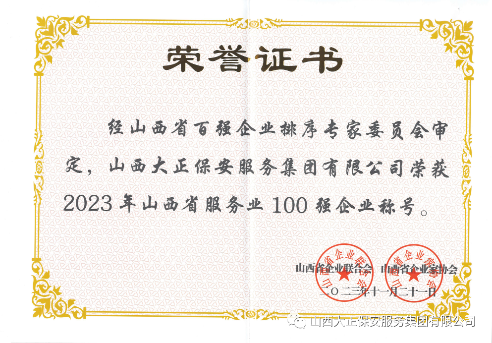 山西大正保安服務(wù)集團(tuán)有限公司作為市屬唯一一家國(guó)有安保企業(yè),22年來(lái)緊緊圍繞強(qiáng)企興企第一要?jiǎng)?wù),把握時(shí)代發(fā)展機(jī)遇,積極貫徹新發(fā)展理念,主動(dòng)擔(dān)當(dāng)作為、認(rèn)真履職盡責(zé),不斷提升服務(wù)水平,努力推動(dòng)建設(shè)國(guó)內(nèi)一流綜合型保安服務(wù)集團(tuán)的步伐,在國(guó)企黨建、內(nèi)部管理、經(jīng)營(yíng)業(yè)績(jī)、企業(yè)文化、安全生產(chǎn)、履行社會(huì)責(zé)任等方面不斷規(guī)范推進(jìn),連續(xù)9年榮獲“山西省服務(wù)業(yè)企業(yè)100強(qiáng)”,展現(xiàn)出山西大正保安集團(tuán)由小變大、由弱變強(qiáng)的奮進(jìn)歷程,創(chuàng)造了山西大正保安集團(tuán)全方位高質(zhì)量發(fā)展的新偉業(yè)。