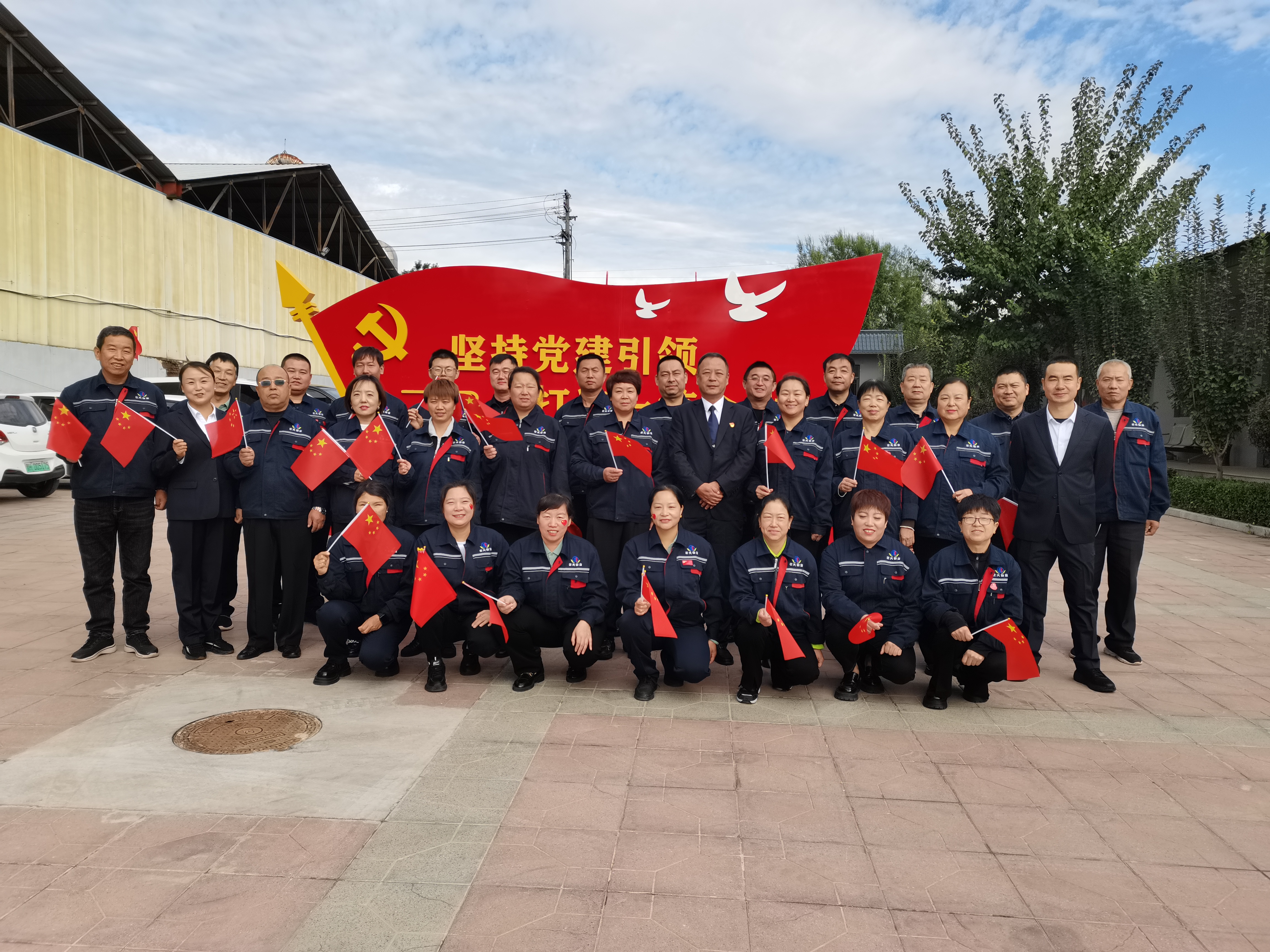 節(jié)日的公司院內(nèi)外,四周花團(tuán)錦簇,大門口燈籠高掛、彩旗飄揚(yáng),為節(jié)日增添了濃厚的喜慶氛圍。公司運(yùn)鈔車、巡邏車、運(yùn)兵車干凈整潔,排列在場地兩側(cè),升旗儀式更顯隆重。9時(shí)30分,集團(tuán)公司、各子公司領(lǐng)導(dǎo)和機(jī)關(guān)各部門、城區(qū)員工共300多人整齊列隊(duì),懷著激動的心情,手持小國旗,臉上貼著愛國貼紙、洋溢幸福的笑容,眼神中充滿了對祖國的熱愛和對升旗儀式的期待。