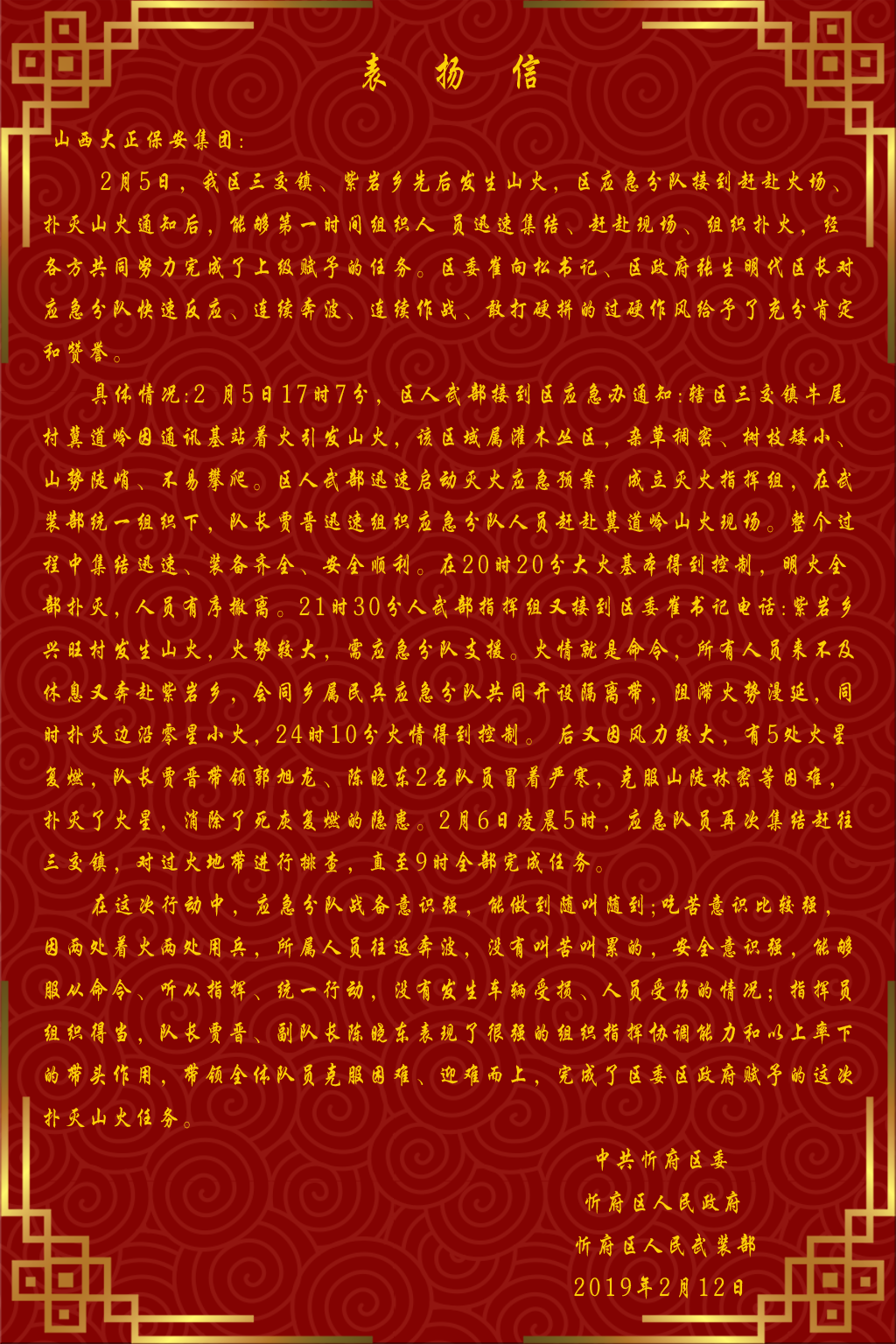另外,2月5日,忻府區(qū)三交鎮(zhèn)、紫巖鄉(xiāng)先后發(fā)生山火,區(qū)應(yīng)急分隊(duì)接到趕赴火場、撲滅山火通知后,公司在第一時(shí)間組織應(yīng)急人員迅速集結(jié)、趕赴現(xiàn)場、組織撲火,全體隊(duì)員攻堅(jiān)克難、英勇奮戰(zhàn)、連續(xù)奔波、連續(xù)作戰(zhàn),經(jīng)各方共同努力圓滿完成了上級(jí)賦予的滅火任務(wù),得到了忻府區(qū)委崔向松書記、張生明代區(qū)長的充分肯定和贊譽(yù)。此外,中共忻府區(qū)委,忻府區(qū)人民政府,忻府區(qū)人民武裝部專程來公司送來表揚(yáng)信,對公司應(yīng)急隊(duì)伍完成此次救火任務(wù),展示了公司隊(duì)伍良好形象進(jìn)行了表揚(yáng)。