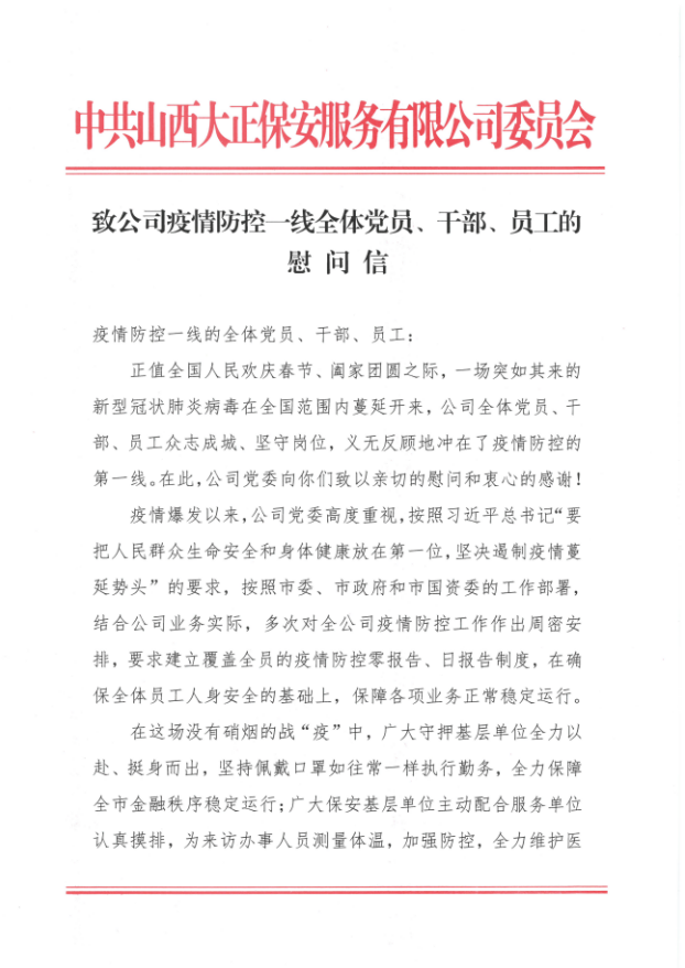 致公司疫情防控一線全體黨員、干部、員工的慰問信