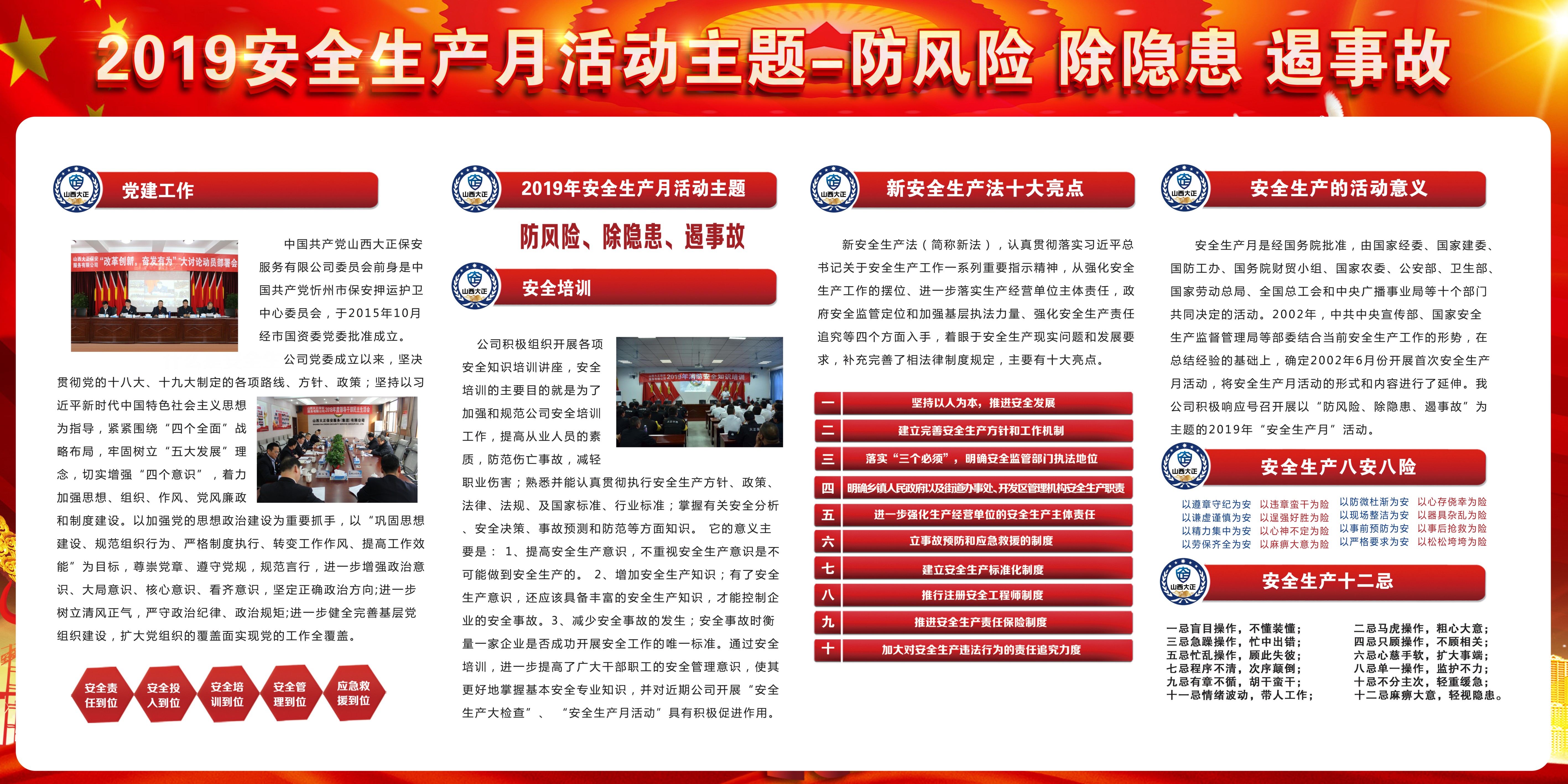根據(jù)省政府安委辦、市政府安委辦要求,公司專門制定實(shí)施方案,周密組織開展以“防風(fēng)險(xiǎn)、除隱患、遏事故”為主題的2019年我公司第18個(gè)“安全生產(chǎn)月”活動(dòng)。