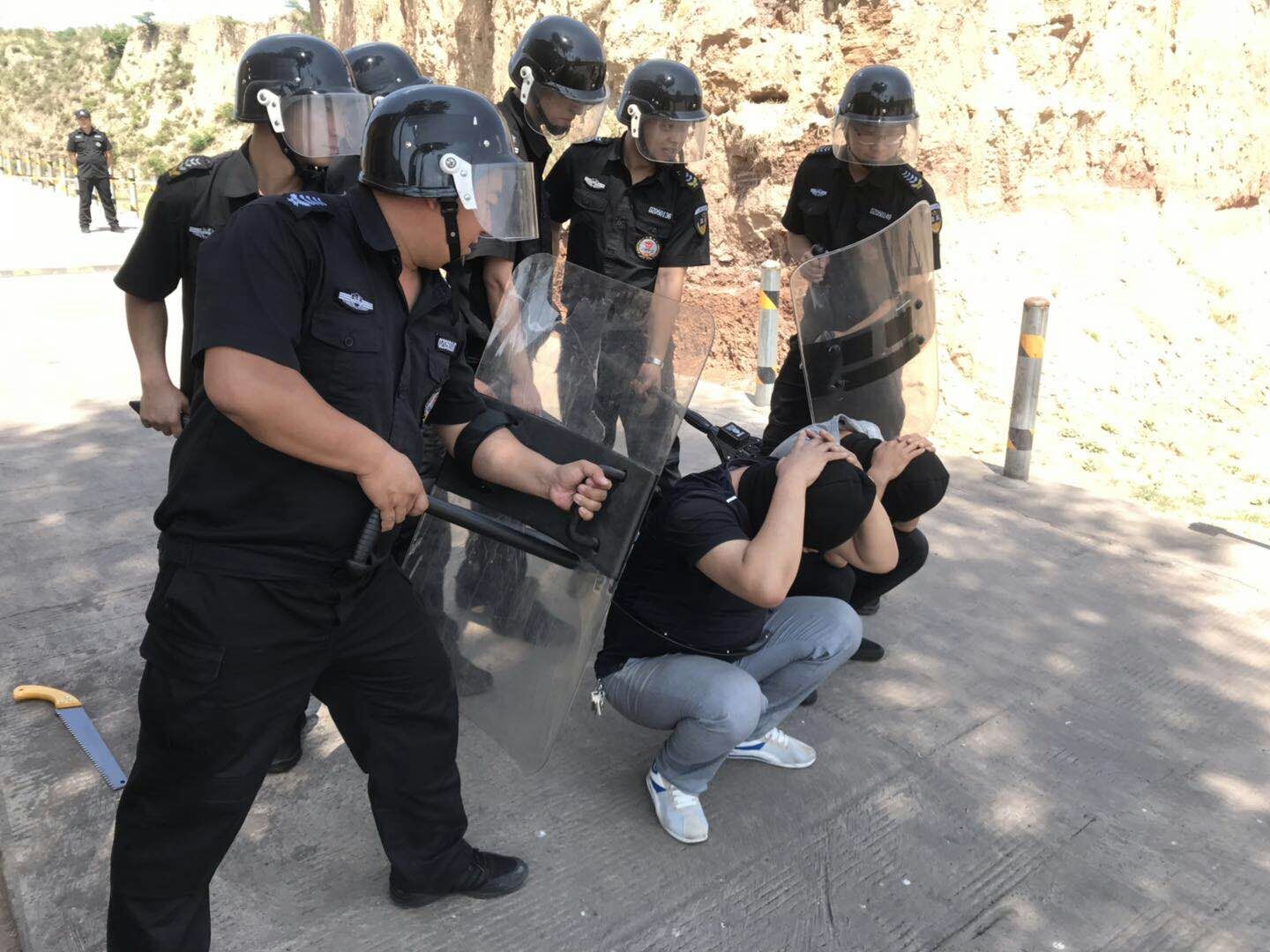 上午9時(shí),接到炸藥庫值班人員的報(bào)警電話,稱有2名不明身份的人員手持兇器,靠近炸藥庫,隨即向服務(wù)單位領(lǐng)導(dǎo)報(bào)告此事。服務(wù)單位領(lǐng)導(dǎo)了解情況后立即下達(dá)啟動(dòng)《炸藥庫應(yīng)急救援預(yù)案》的命令,并做具體安排。9點(diǎn)30分左右,全體隊(duì)員在現(xiàn)場(chǎng)指揮員的命令下,裝備好防爆器械在辦公樓前整裝待發(fā)。所有隊(duì)員到達(dá)炸藥庫后,發(fā)現(xiàn)兩名歹徒在炸藥庫大門外準(zhǔn)備沖擊炸藥庫,F(xiàn)場(chǎng)總指揮作安排,隊(duì)員分成三組實(shí)施抓捕。第一小組控制炸藥庫大門左邊通道,第二小組從炸藥庫圍墻迂回包抄,控制炸藥庫右邊通道,第三小組從炸藥庫正前方阻擊。在走投無路的重重包圍下,兩名歹徒棄械投降并被制服。隨后,現(xiàn)場(chǎng)人員向服務(wù)單位領(lǐng)導(dǎo)報(bào)告了現(xiàn)場(chǎng)情況,之后,迅速集結(jié)所有參戰(zhàn)人員聆聽總結(jié)評(píng)價(jià)。